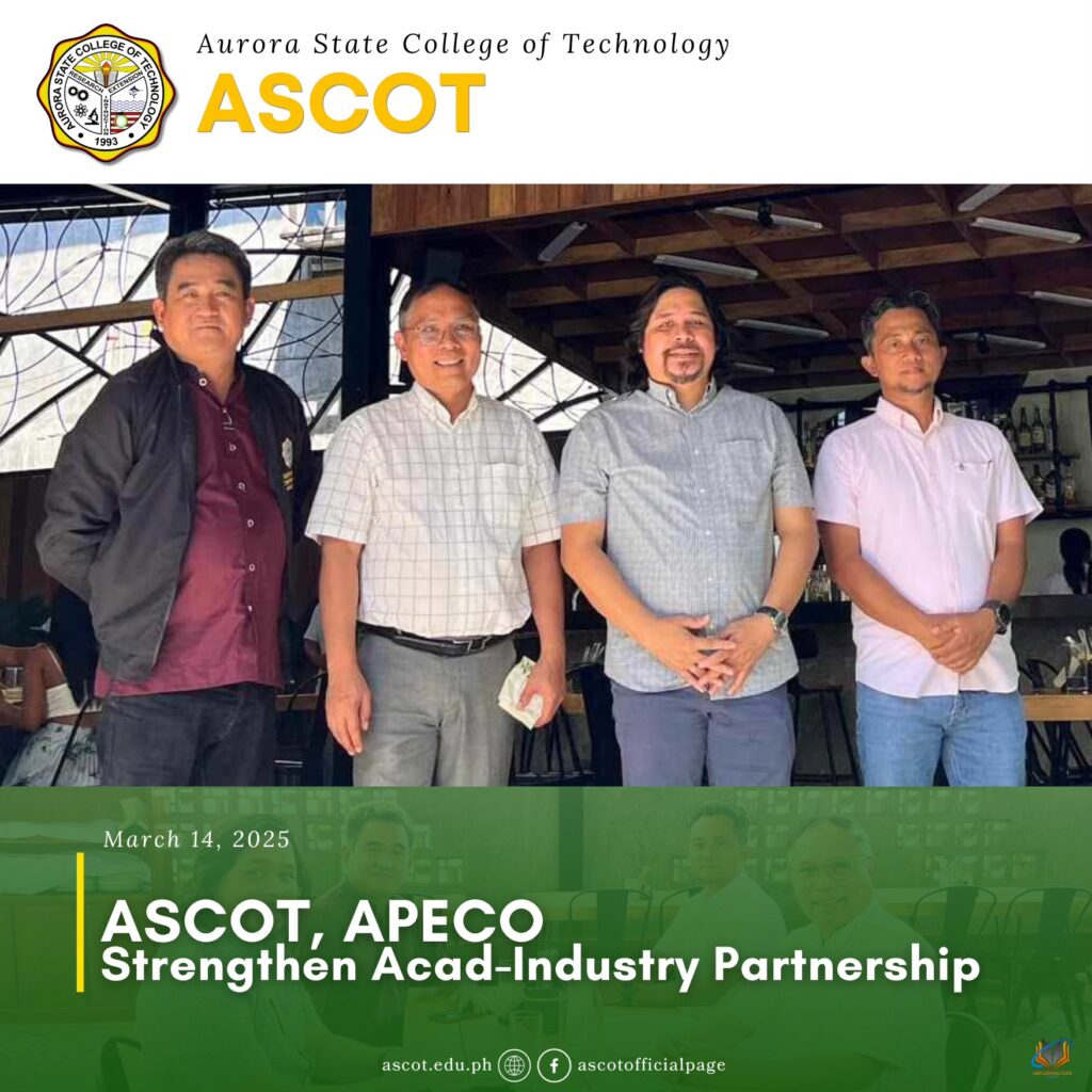 March 14, 2025 – Aurora State College of Technology (ASCOT) President Dr. Renato G. Reyes met with Aurora Pacific Economic Zone and Freeport Authority (APECO) President Atty. Gil Gianan Taway IV to discuss collaborations in education, research, and industry development in Aurora.
