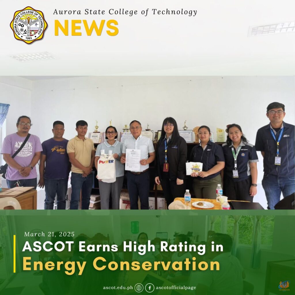 March 21, 2025 – Aurora State College of Technology (ASCOT) continues to lead in sustainability, earning top marks in the Department of Energy (DOE) Energy Audit. Zabali Campus, Baler scored 90.2% (Grade A), while Bazal Campus , Maria Aurora achieved 87.2% (Grade B), reflecting ASCOT’s strong commitment to energy efficiency.