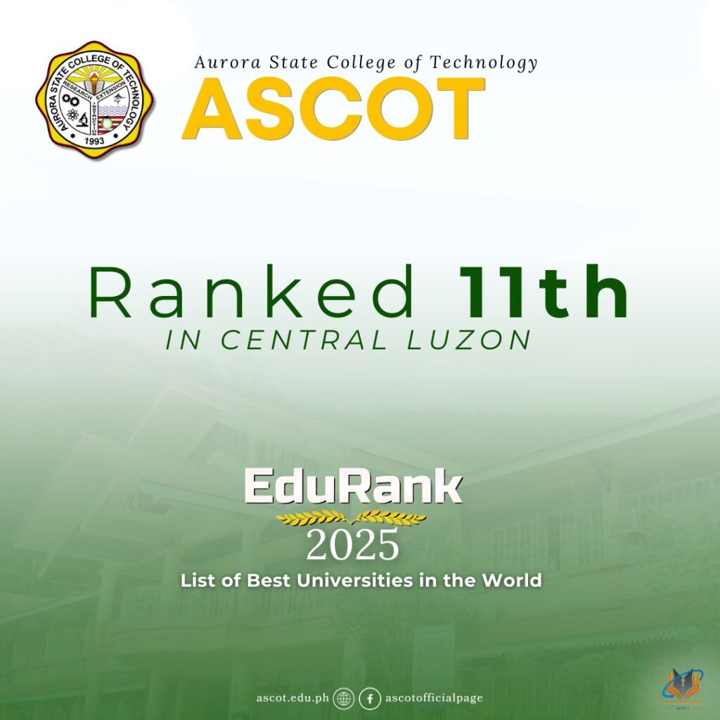 March 7, 2025 – Aurora State College of Technology (ASCOT) is ranked 11th in Central Luzon, 169th in the Philippines, and 5,103rd in Asia in the 2025 EduRank rankings.