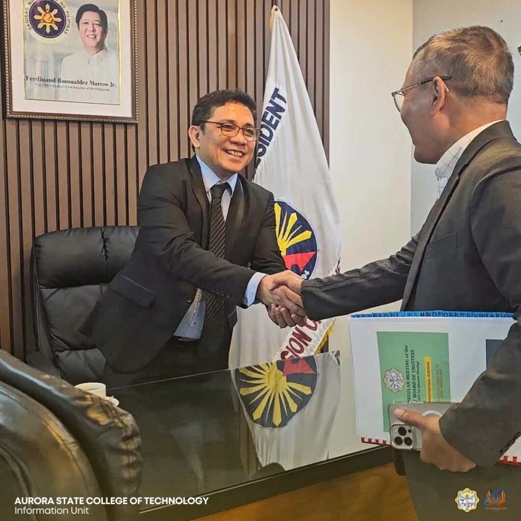 March 21, 2025 – Aurora State College of Technology (ASCOT) President Dr. Renato G. Reyes led a courtesy visit to the newly appointed Chairperson of the ASCOT Board of Trustees (BOT), CHED Commissioner Desiderio Apag III, at the Commission on Higher Education (CHED) Office in Diliman, Quezon City.