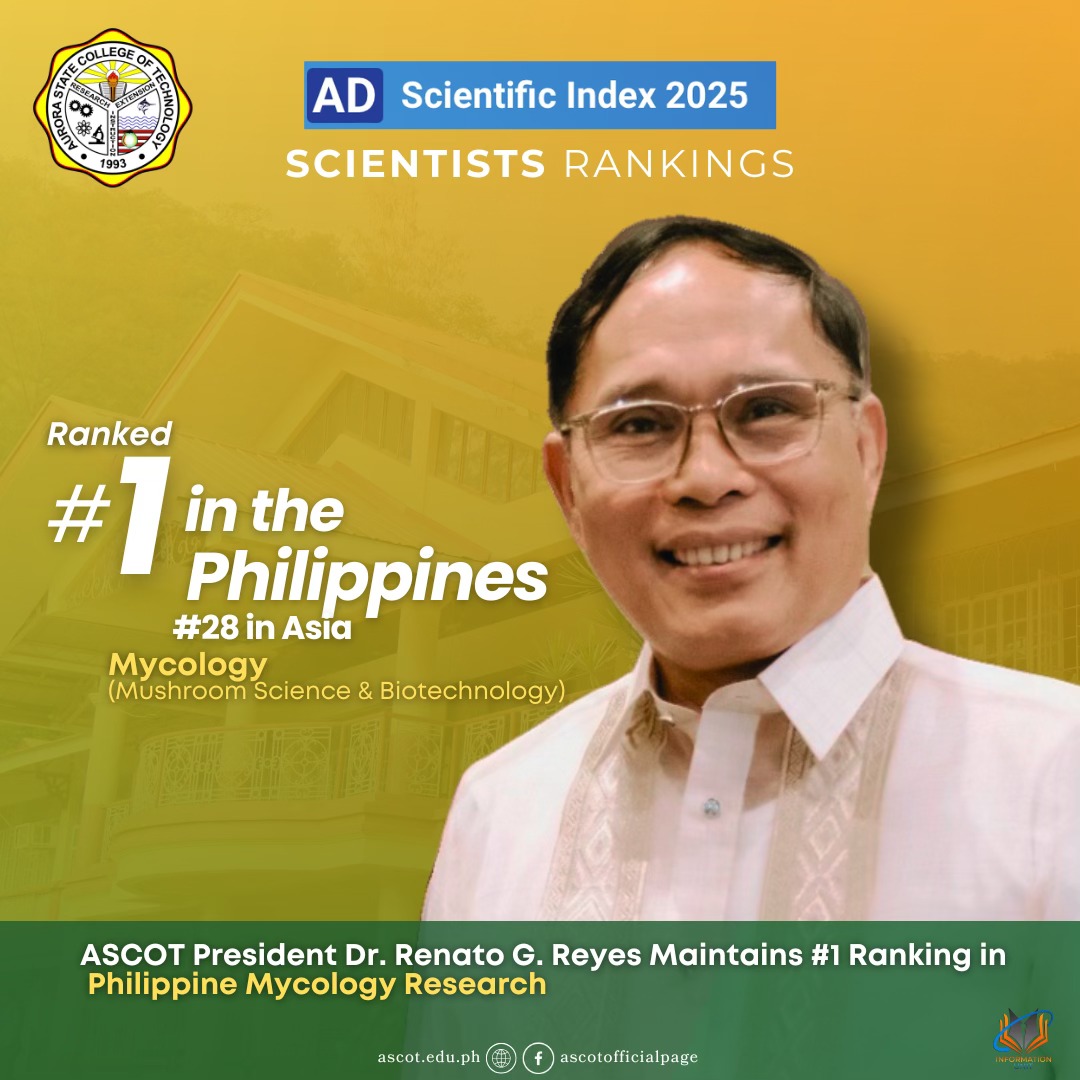 Aurora State College of Technology (ASCOT) proudly celebrates the sustained accomplishments of its President, Dr. Renato G. Reyes, who remains the top-ranked Mycologist in the Philippines as per the latest AD Scientific Index 2025—a global ranking that assesses the impact and productivity of researchers based on citations and academic influence. The AD Scientific Index continue reading : ASCOT President Dr. Renato G. Reyes Maintains #1 Ranking in Philippine Mycology Research