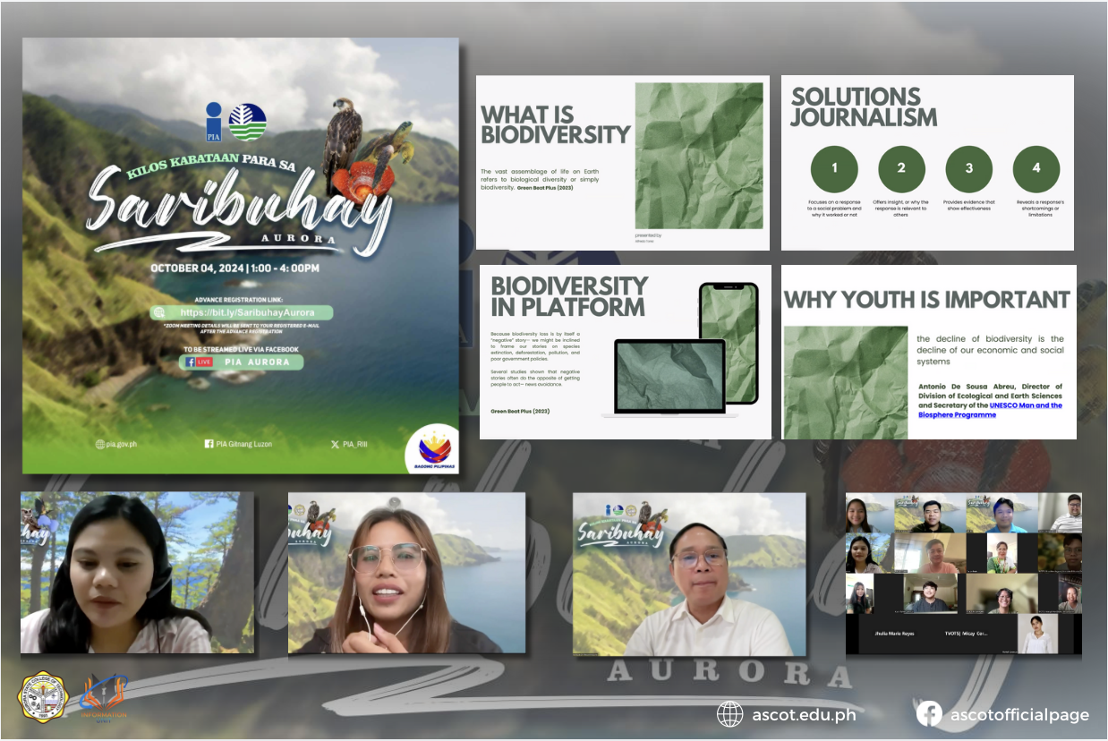 October 4, 2024 – The Aurora State College of Technology (ASCOT) participated in the Aurora leg of the online forum titled “Kilos Kabataan Para sa Saribuhay” through Zoom video conferencing. This forum is part of a series of dynamic events organized by the Philippine Information Agency (PIA) Region III, aimed at empowering the youth continue reading : ASCOT Joins “Kilos Kabataan Para sa Saribuhay” Virtual Forum on Youth-Led Biodiversity Conservation
