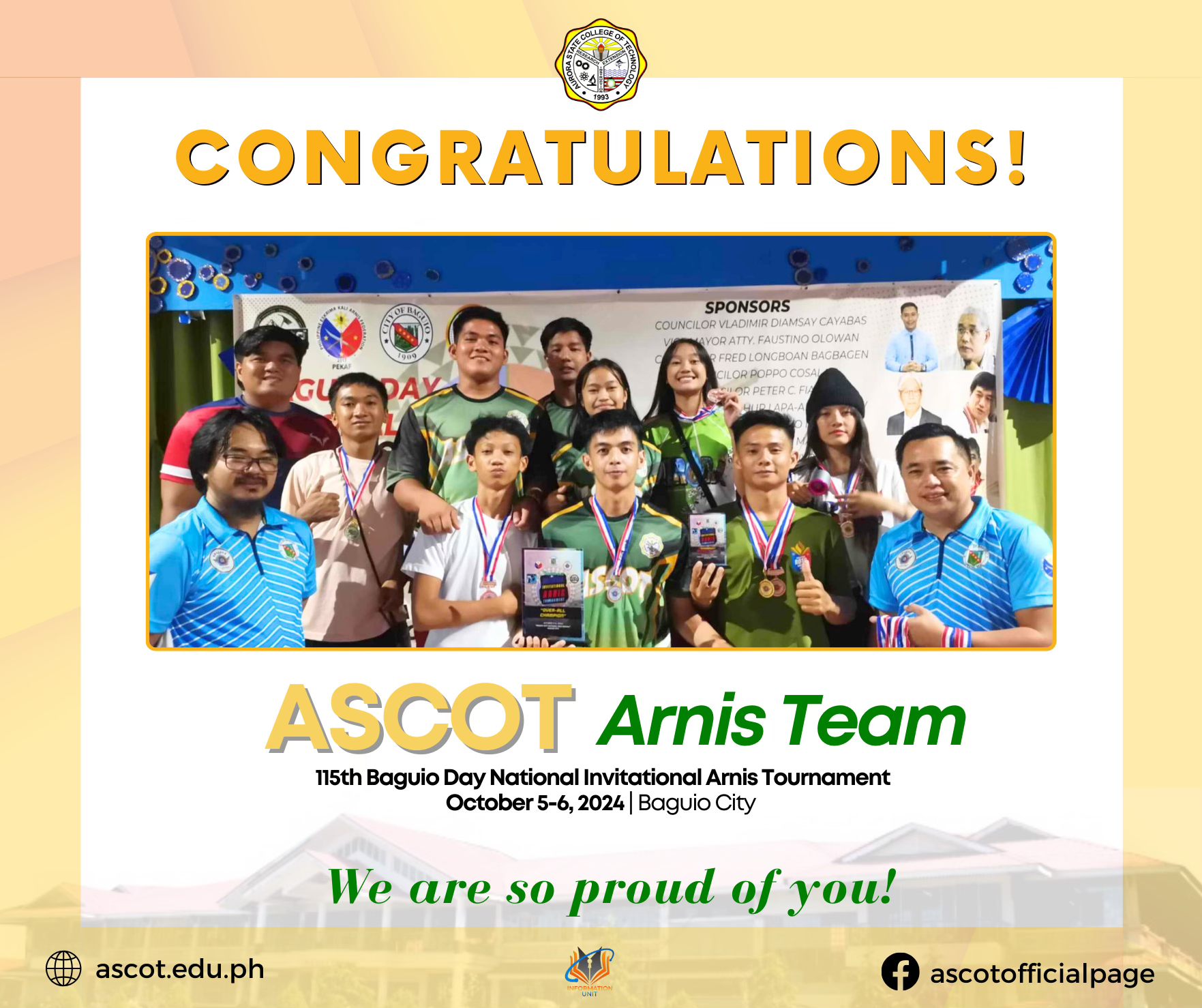 Congratulations to the ASCOT athletes who proudly represented Aurora Province at the 115th Baguio Day National Invitational Arnis Tournament on October 5-6 in Baguio City! Our team brought home 4 Gold, 2 Silver, and 10 Bronze medals! and bagged 3rd Place at the Senior Division, Junior Division: Angel Joy Lagulao – continue reading : ASCOT Athletes Shine and Bring Home Pride