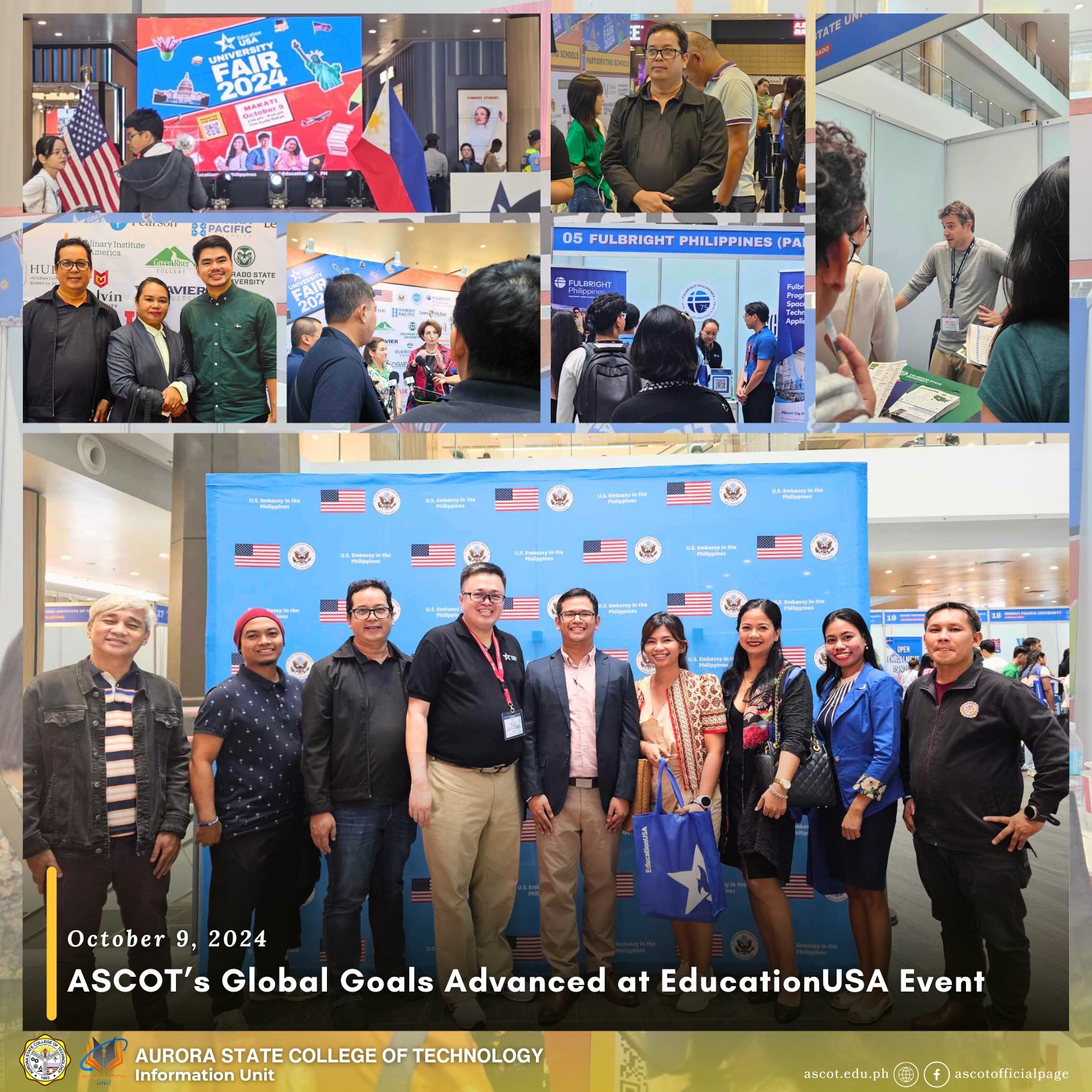 October 9, 2024 – The Aurora State College of Technology (ASCOT) participated in the EducationUSA University Fair 2024, held at One Ayala Mall in Makati City. Organized by the U.S. Embassy, the fair showcased the largest gathering of U.S. higher education institutions in the Philippines, with 43 universities and colleges in attendance. The event continue reading : ASCOT’s Global Goals Advanced at EducationUSA Event
