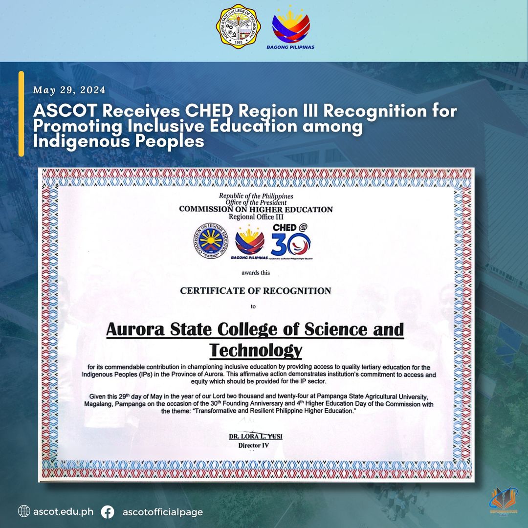 May 29, 2024 – The Commission on Higher Education (CHED) Region III awarded the Aurora State College of Technology (ASCOT) with a Certificate of Recognition for its commendable contribution to providing quality tertiary education to Indigenous Peoples (IP) in the Province of Aurora. This recognition was conferred during the commemoration of CHED’s 30th Founding Anniversary continue reading : ASCOT Receives CHED Region III Recognition for Promoting Inclusive Education among Indigenous People
