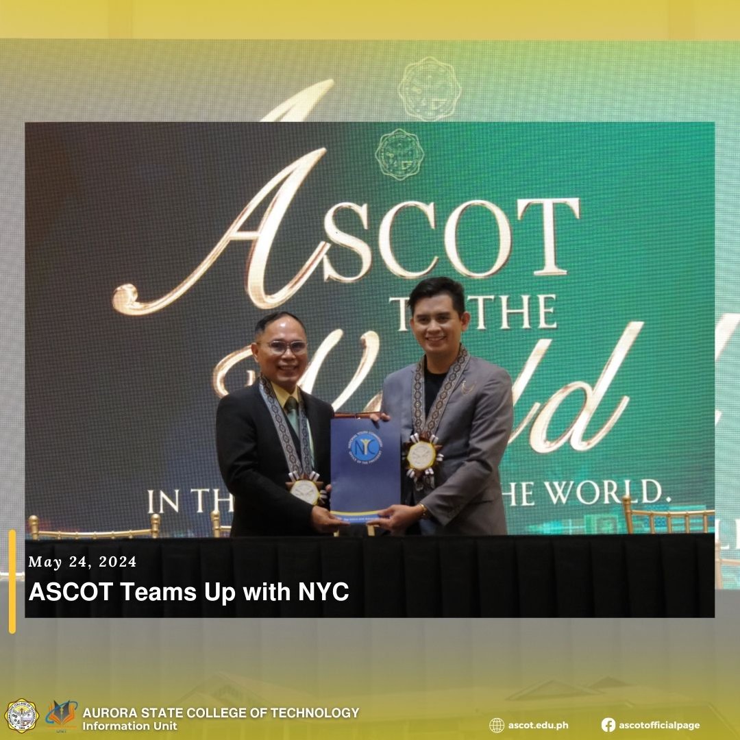 May 24, 2024, Baler Convention Center- The Aurora State College of Technology (ASCOT) President Dr. Renato G. Reyes and ASCOT Alumnus Mr. Kevin A. Sanchez of National Youth Commission (NYC) together in a photo for a ceremonial signing, symbolizing the commencement of a promising collaboration. Amidst the ASCOT Meet and Greet Gala, Dr. Reyes’ pursuit continue reading : ASCOT Teams Up with NYC