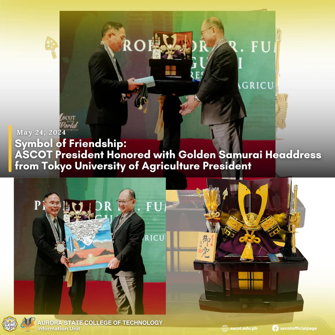 May 24, 2024 – At the recent ASCOT Meet and Greet Gala held at the Baler Convention Center in Baler, Aurora, a heartwarming moment unfolded as Dr. Fumio Eguchi, President of Tokyo University of Agriculture, presented a golden samurai headdress as gift to ASCOT President Dr. Renato G. Reyes. The exchange was more than just continue reading : Symbol of Friendship: ASCOT President Honored with Golden Samura Headdress from Tokyo University Agriculture President