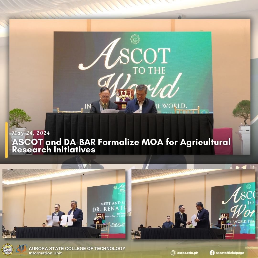 May 24, 2024 – ASCOT President Dr. Renato G. Reyes and Director Junel Soriano, PhD, from the Department of Agriculture – Bureau of Agricultural Research (DA-BAR), formalized a Memorandum of Agreement (MOA) during ASCOT’s Meet and Greet Gala, Partnership for Progress Event, held at the Baler Convention Center. The MOA establishes DA-BAR’s involvement in two continue reading : ASCOT and DA-BAR Formalize MOA for Agricultural Research Initiatives