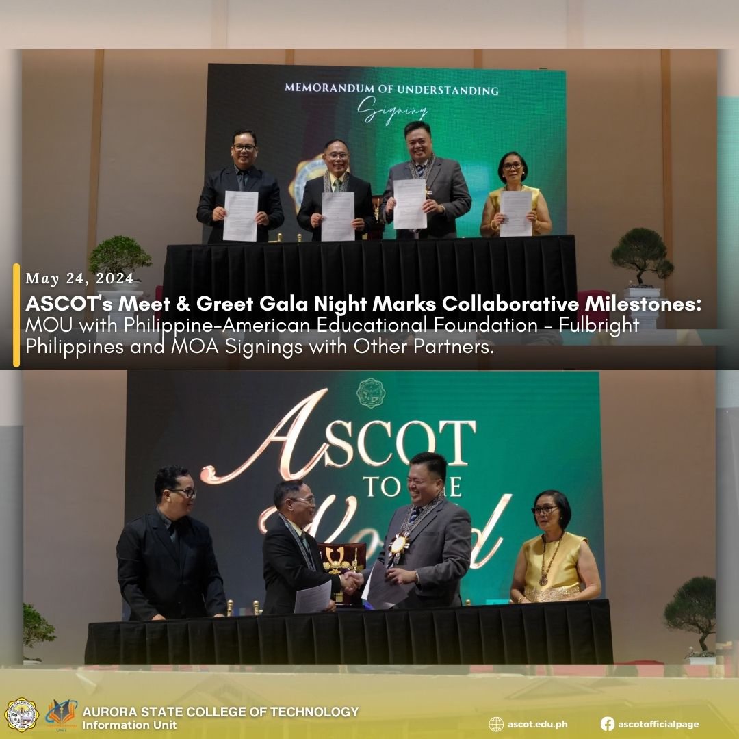 May 24, 2024 – Dr. Renato G. Reyes, President of Aurora State College of Technology (ASCOT), hosted a Meet and Greet Gala at the Baler Convention Center, serving as both a celebration of leadership and a platform for forging impactful partnerships. During the event, Mr. Julio S. Amador III, Executive Director of the Philippine-American Educational continue reading : ASCOT’s Meet and Greet Gala Marks Collaborative Milestones: MOU with Philippine American Educational Foundation – Fullbright Philippines and MOA Signings with other partners
