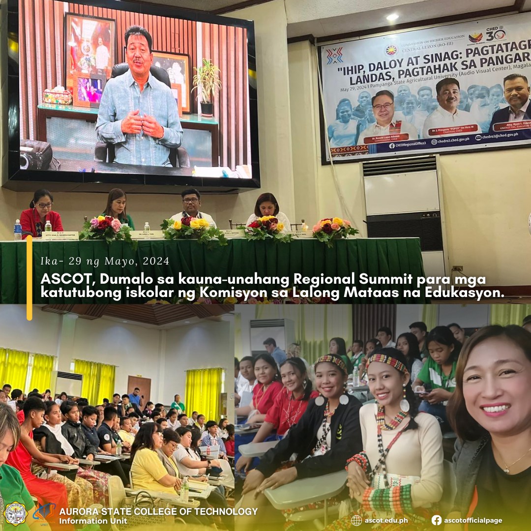 Ika-29 Mayo 2024, PSAU (Audio-Visual Center)- Dumalo ang Aurora State College of Technology sa pangunguna ni Dr. Renato G. Reyes (Pangulo) kasama si Gng. Alma S. Bayudan, Direktor ng Student Affairs Services sa kauna-unahang Regional Summit para mga katutubong iskolar ng Komisyon sa Lalong Mataas na Edukasyon. May temang “Ihip, Daloy, at Sinag: Pagtatagpo ng continue reading : BALITA: ASCOT, dumalo sa kauna-unahang Regional Summit para sa mga katutubong Iskolar ng Lalong Mataas na Edukasyon