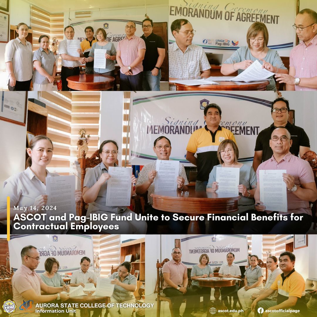 May 14, 2024 – Aurora State College of Technology (ASCOT) and Pag-IBIG Fund have signed a Memorandum of Agreement (MOA) regarding contributions from employees under Job Order and Contract of Service status. The signing included ASCOT President Renato G. Reyes, Pag-IBIG Cabanatuan Branch Manager Reynate L. Pasaraba, and Pag-IBIG Central Luzon II Area Head Amy continue reading : ASCOT and Pag-IBIG Fund Unite to Secure Financial Benefits for Contractual Employee