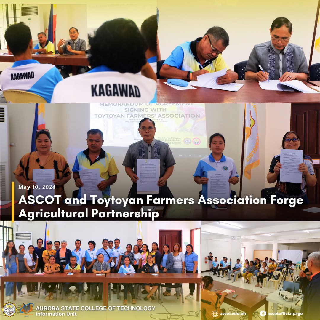 May 10, 2024- The Aurora State College of Technology (ASCOT) and the Toytoyan Farmers Association inked a Memorandum of Agreement (MoA) aimed at enhancing collaboration for mutual benefit. ASCOT pledges to provide technical expertise and resources to uplift agricultural practices in Toytoyan, while the association will act as a conduit for knowledge exchange within the continue reading : ASCOT and Toytoyan Farmers Association Forge Agricultural Partnership
