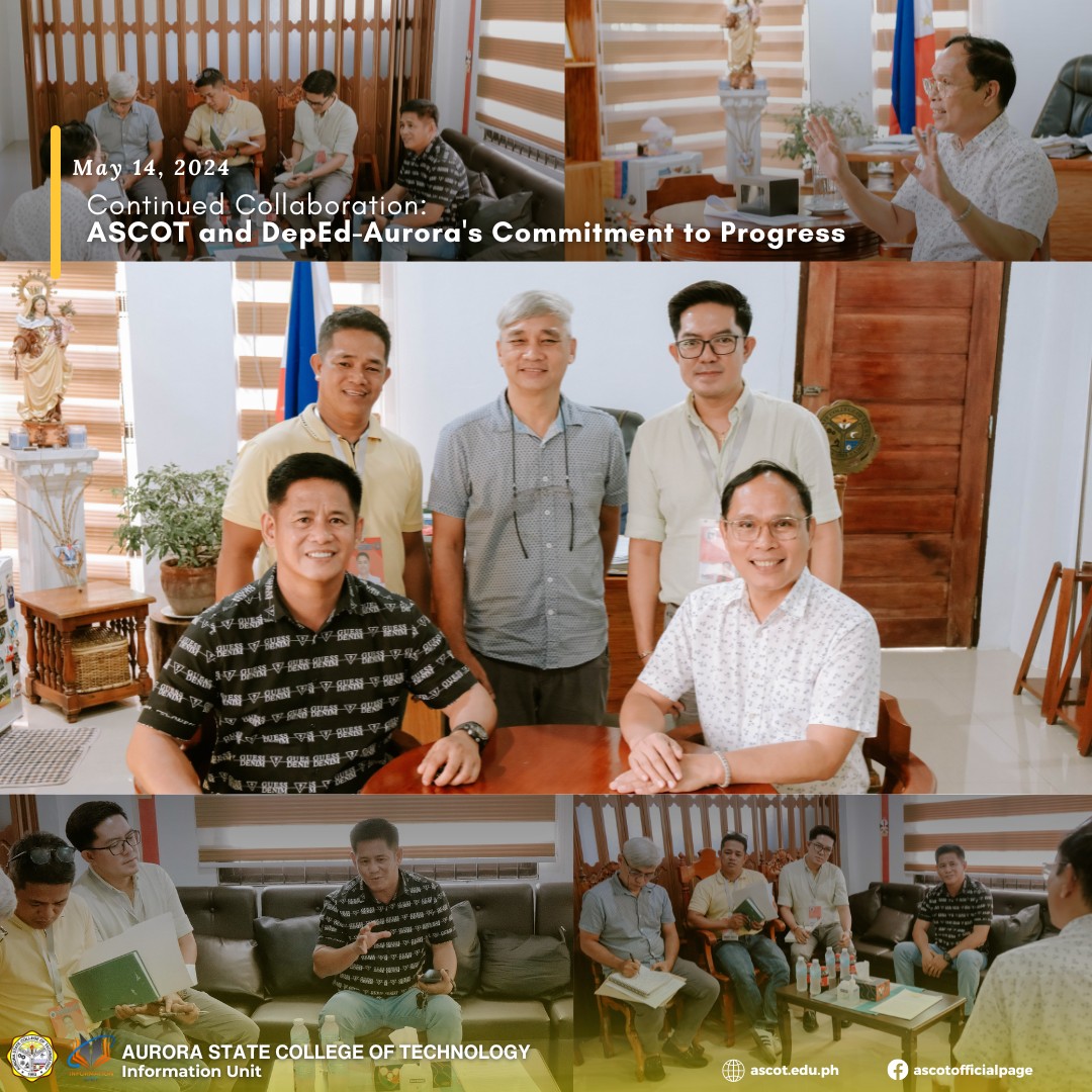 May 14, 2024- ASCOT President Renato G. Reyes recently engaged in a productive dialogue with key officials from the DepEd Schools Division Office – Aurora. The meeting included Dr. Erleo T. Villaros, OIC Assistant Schools Division Superintendent; Dr. Alfredo M. Lopez, Jr., Senior Education Program Specialist; and Armando Bihasa, Education Program Specialist. Their discussion focused continue reading : Continued Collaboration: ASCOT and DepEd Aurora’s Commitment to Progress