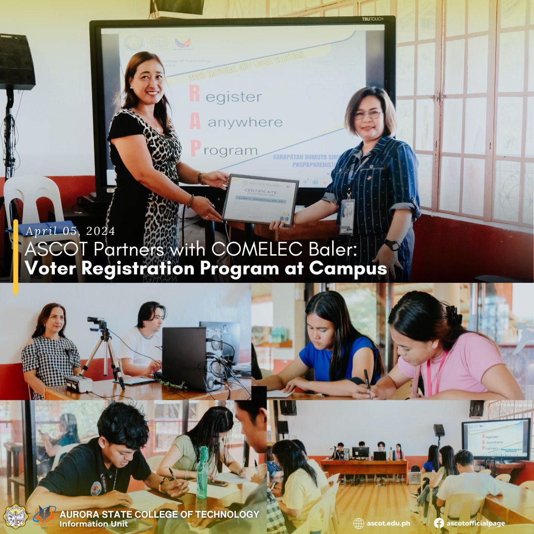 April 5, 2024 – The Commission on Elections (COMELEC) Baler, in collaboration with the Aurora State College of Technology (ASCOT) Students Affairs and Services Office, organized the Register Anywhere Program (RAP) at the ASCOT accreditation hall. The Register Anywhere Program, available in all capital cities, towns, and highly urbanized cities nationwide, provides essential voter registration continue reading : ASCOT COMELEC Collaborate to Bring Voter Registration to Campus