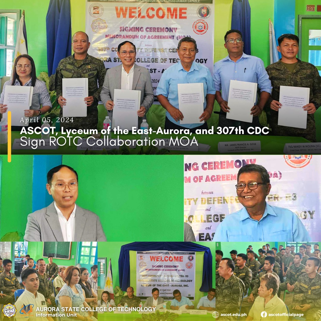 April 5, 2024- The 307th Community Defense Center (307CDC) of Region 3 formalized a Memorandum of Agreement (MoA) with the Aurora State College of Technology (ASCOT) and Lyceum of the East, Aurora Inc. The signing ceremony, held at the Lyceum of the East Maria Aurora, Aurora, solidified the partnership aimed at enhancing Reserve Officers Training continue reading : ASCOT Lyceum of the East and the 307th Community Defense Center Sign MOA for ROTC Collaboration