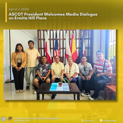April 1, 2024 – During the visit to ASCOT, media personalities Grace Sansano (DZRH), Bernie Rada (One-FM Baler), Ariel Avendaño (Manila Bulletin/DZJO), and Chris Sansano (TV5/Manila Times/DWWW 77.4) engaged in discussions with ASCOT President Renato G. Reyes, alongside Dr. Oscar C. Barawid, Vice President for Administration, Planning and Finance, and Ms. Diana Rose P. De continue reading : ASCOT President Welcomes Media Dialogue on Ermita Hills Plans