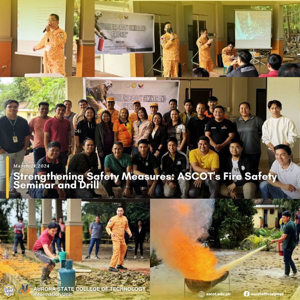 March 21, 2024 – The Aurora State College of Technology Disaster Risk Reduction and Management Office (ASCOT DRRMO), under the leadership of its unit head, For. Mark Christian Facun, took proactive steps in enhancing community safety by organizing a comprehensive Fire Safety Seminar and Drill. This initiative aimed to equip participants with the necessary knowledge continue reading : Strengthening Safety Measures: ASCOT’s Fire Safety Seminar