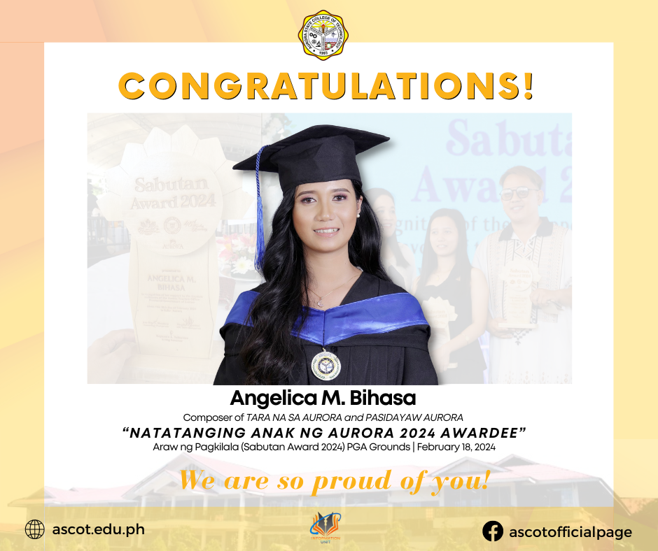 ASCOT singer-composer alumna Angelica M. Bihasa is honored during the Araw ng Pagkilala, Natatanging Anak ng Aurora Ceremony and Recognition on February 18, 2024, at the PGA grounds. She composed the Aurora Provincial Tourism Jingle, which can be heard over local radio stations, “Tara na sa Aurora,” and the ADC 2024 official theme song, “Pasidayaw continue reading : Congaratulations, Angelica!
