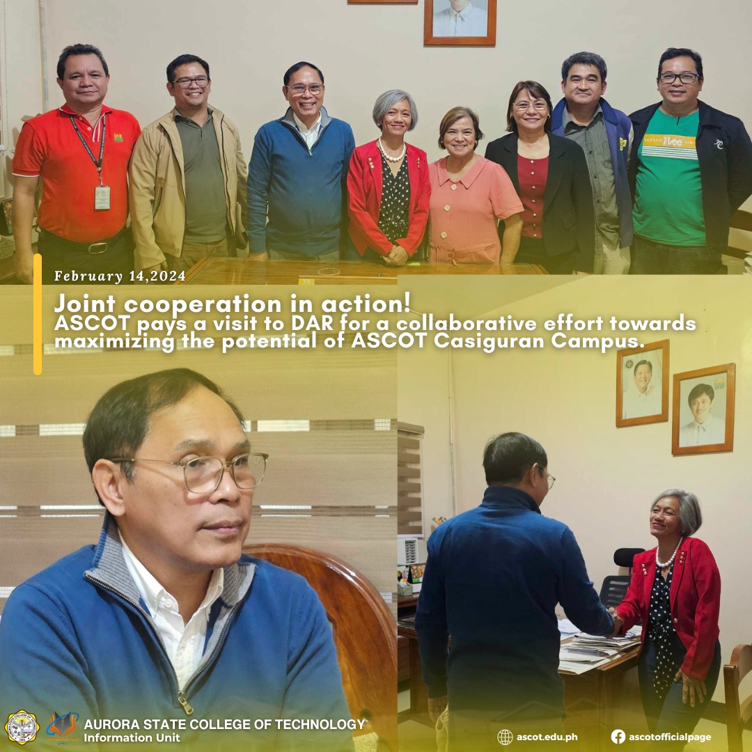 ASCOT President Renato G. Reyes and key college officials visited the Department of Agrarian Reform (DAR)-Aurora office to discuss collaboration and seek support for the improvement of the ASCOT Casiguran Campus. From ASCOT are Engr. Oscar Barawid, Ph.D. (VP for Administration, Planning, and Finance), Atty. Karl Thomas Olivar (Legal Officer), and Joseph T. Gonzales (Board continue reading : Joint Cooperation in Action!