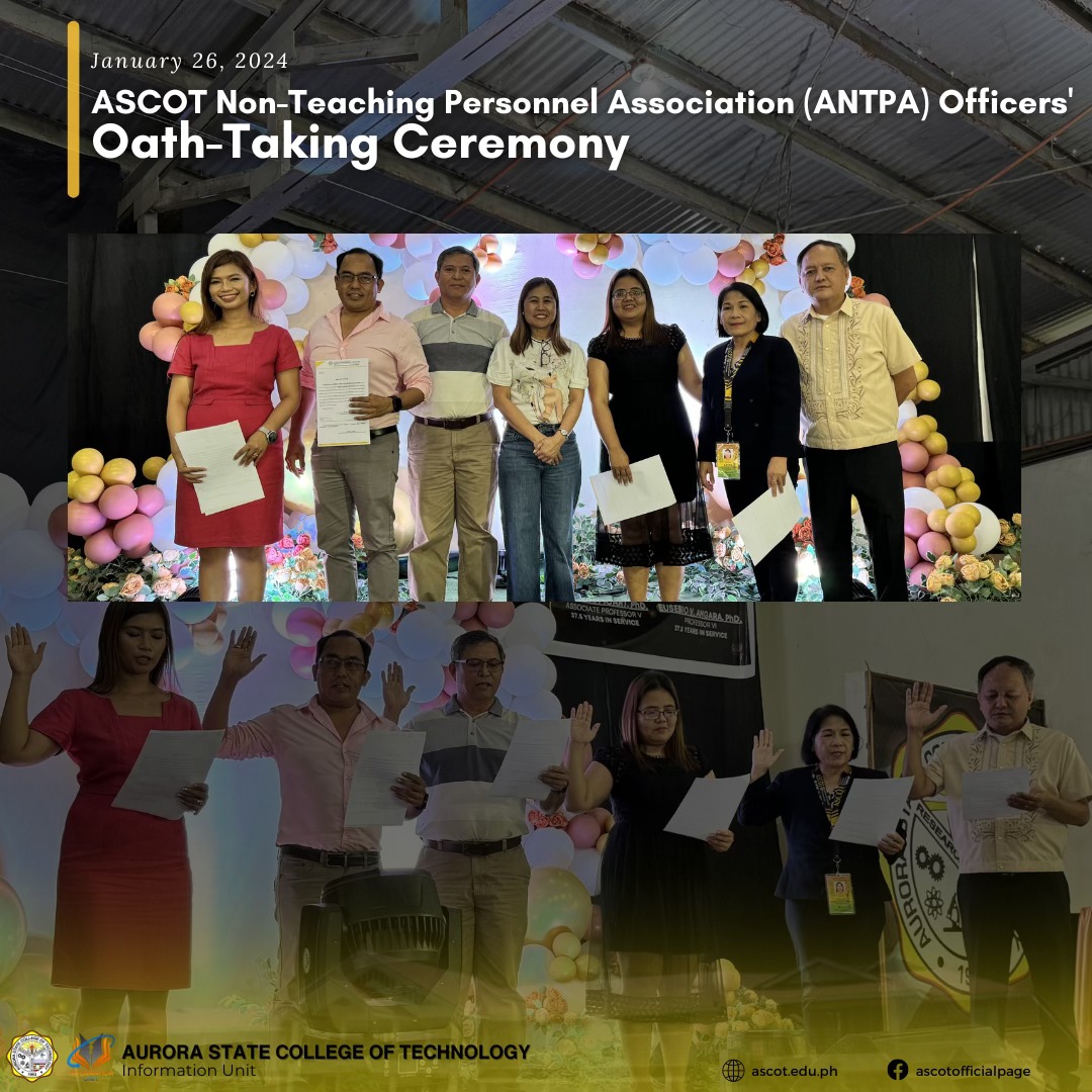 January 26, 2024: The ASCOT Non-Teaching Personnel Association proudly welcomed its newly elected officers as they took their oaths of office. The oath-taking ceremony was graciously presided over by ASCOT OIC, College President Lora L. Yusi, DPA. The newly-inducted officers are as follows: * President: Godfrey G. Gudoy, Information Technology Officer I * Vice President: continue reading : ASCOT Non-Teaching Personnel Association (ANTPA) Officers’ Oath Taking Ceremony