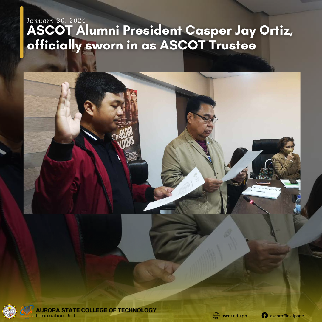 January 30, 2024: Casper Jay Ortiz, President of the ASCOT Alumni Association, proudly took the oath as an official member of the ASCOT Board of Trustees. CHED Commissioner Ronald L. Adamat presided over the oath-taking ceremony. As a new member of the ASCOT BOT, he exercised his right by casting his vote in the recently continue reading : LOOK l ASCOT Alumni President Casper Jay Ortiz, officially sworn in as ASCOT Trustee