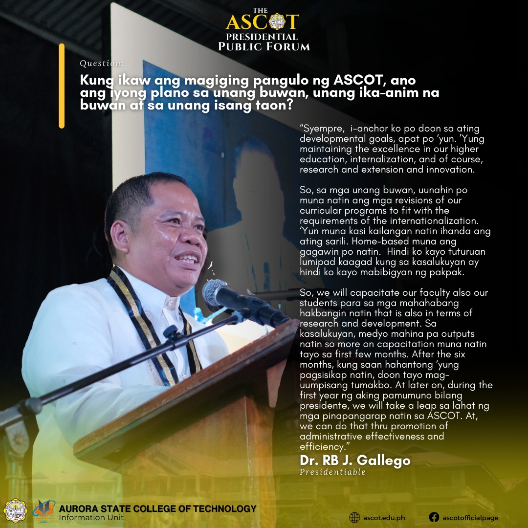 The search for Aurora State College of Technology – ASCOT’s next president intensified with three contenders: Dr. Roel P. Anicas, Dr. RB J. Gallego, and Dr. Renato G. Reyes. Held on January 9, 2024 at the ASCOT Gymnasium, the forum allowed each presidentiable to present their visions, missions and goals. Attended by the public and continue reading : HIGHLIGHTS: The ASCOT Presidential Public Forum