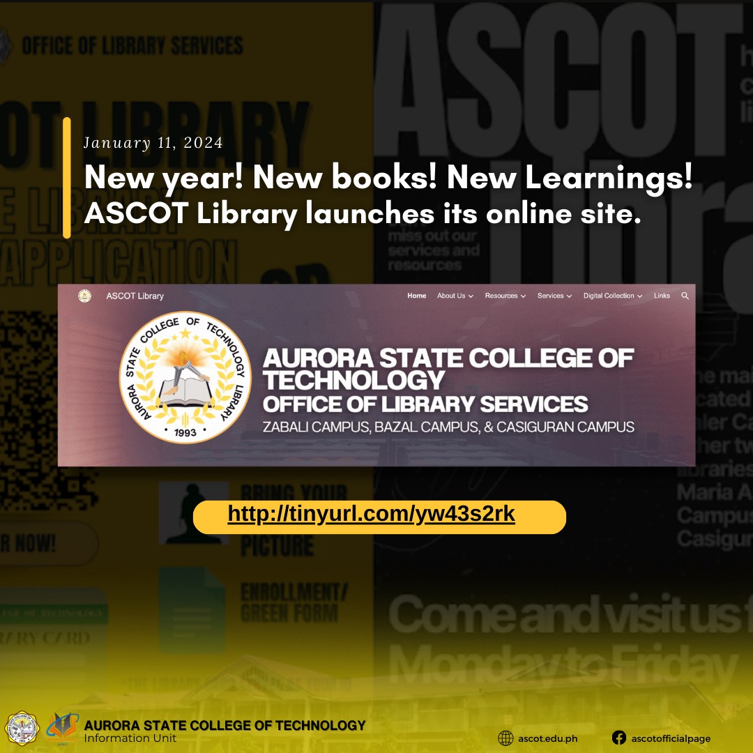 ASCOT Library launches its online site This makes every Library services available not only to the students of ASCOT but also to the community. The ASCOT Library site features its new books acquisition, online public access catalog, access free electronic resources, library instructions, and learn more about the library. It uses the Dewey Decimal Classification continue reading : ASCOT Announcement l New year! New books! New Learnings!
