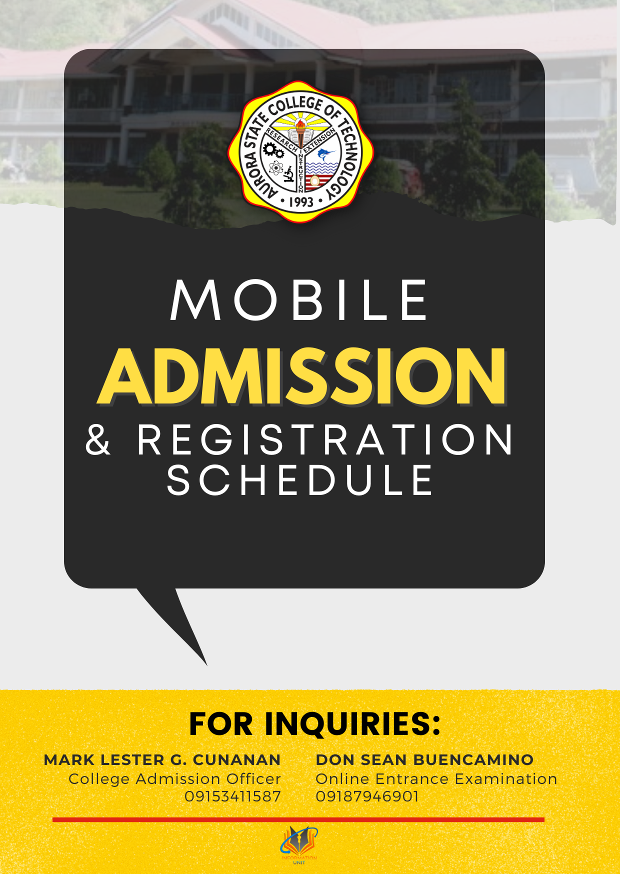 Get ready for the Mobile Admission Registration for AY 2023-2024! Check the attached social media cards for dates in your area. For assistance, contact: Mark Lester G. Cunanan, College Admission Officer: 0915-341-1587 Don Sean Arvie V. Buencamino, Administrator Online Entrance Examination : 0918-794-6901 Join ASCOT now!