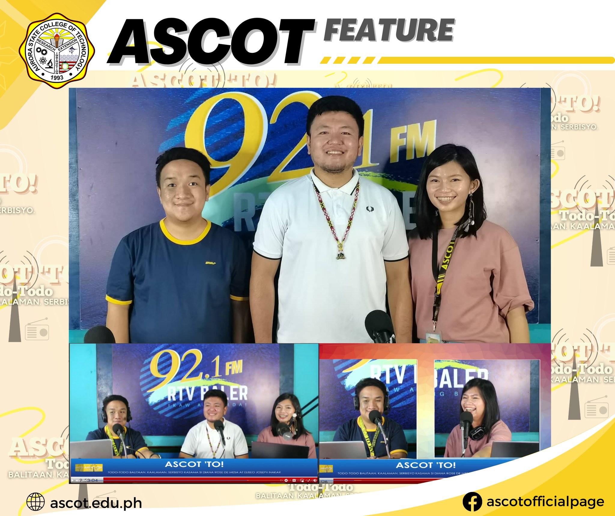 The Aurora State College of Technology’s Radio Drama Team, “Team Alun,” who won the 3rd runner-up spot in the recently concluded CAASUC 3 Culture and the Arts Festival 2022, served as our guests for today’s episode of ASCOT ‘TO (Todo-Todo) at 92.1 FM RTV Baler! In our program’s Episode 51 (Team Alun in the House), continue reading : ASCOT | Feature: ASCOT ‘TO Episode 51: Team Alun in the House!