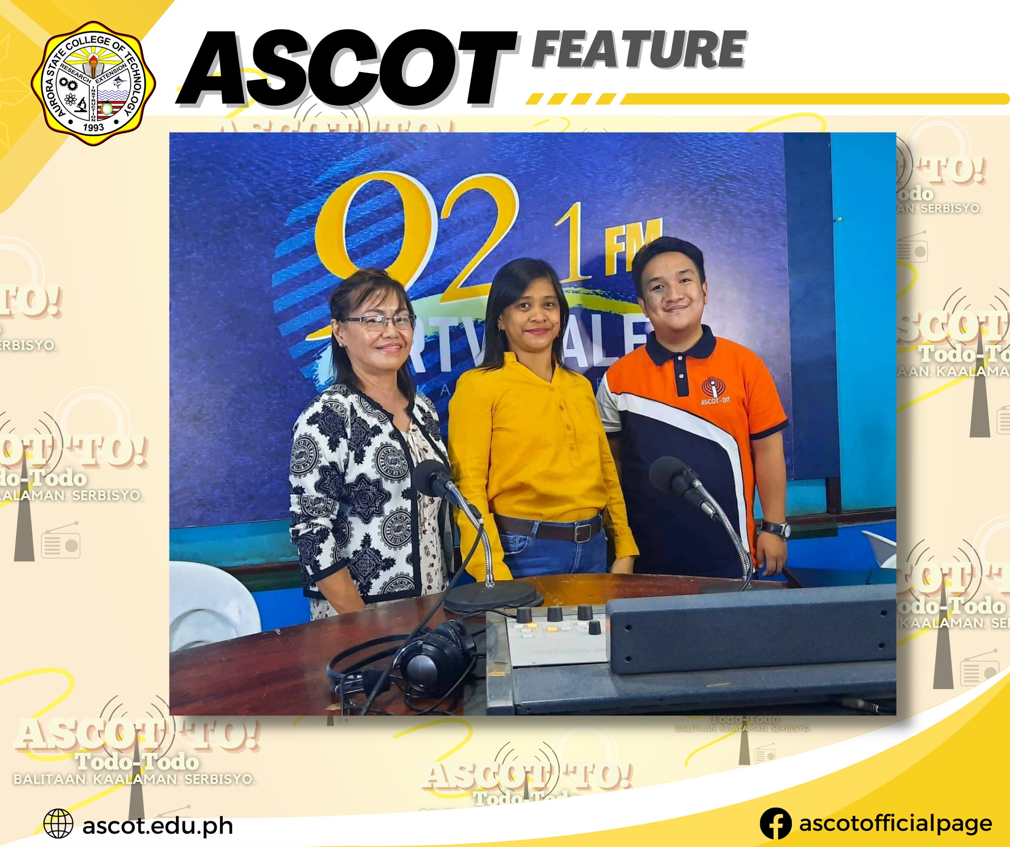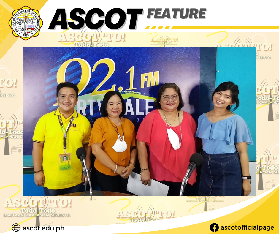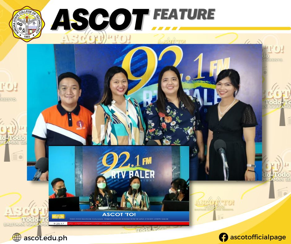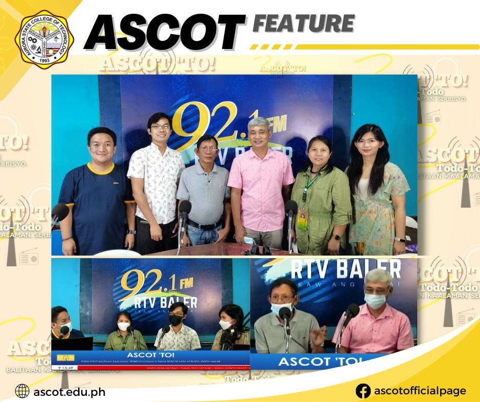 Our College’s Research and Development Services Office Director, Forester Maria Cristina B. Cañada, served as our guest for today’s episode of ASCOT ‘TO (Todo-Todo) at 92.1 FM RTV Baler! In this episode, entitled “RnD Wow!”, our guest shared with our listeners the goals and objectives of the RnD Office, aligned with the ASCOT Research Agenda, continue reading : ASCOT | Feature: ASCOT ‘TO Episode 28: RnD Wow! (Research and Development Services Office)