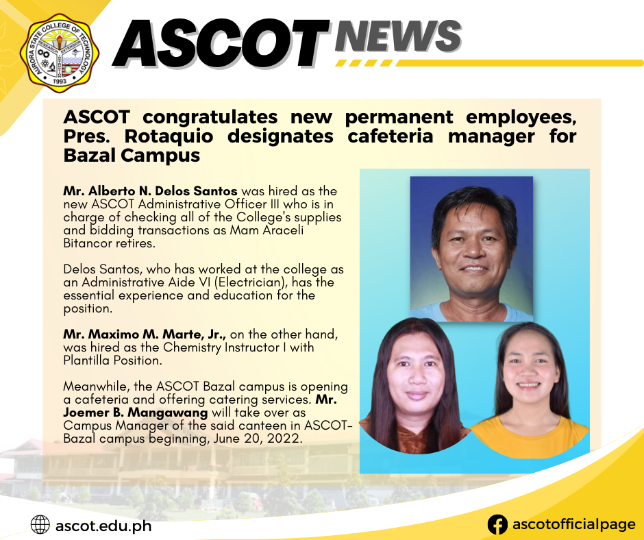 ASCOT | News Brief: ASCOT congratulates new permanent employees, Pres. Rotaquio designates cafeteria manager for Bazal Campus