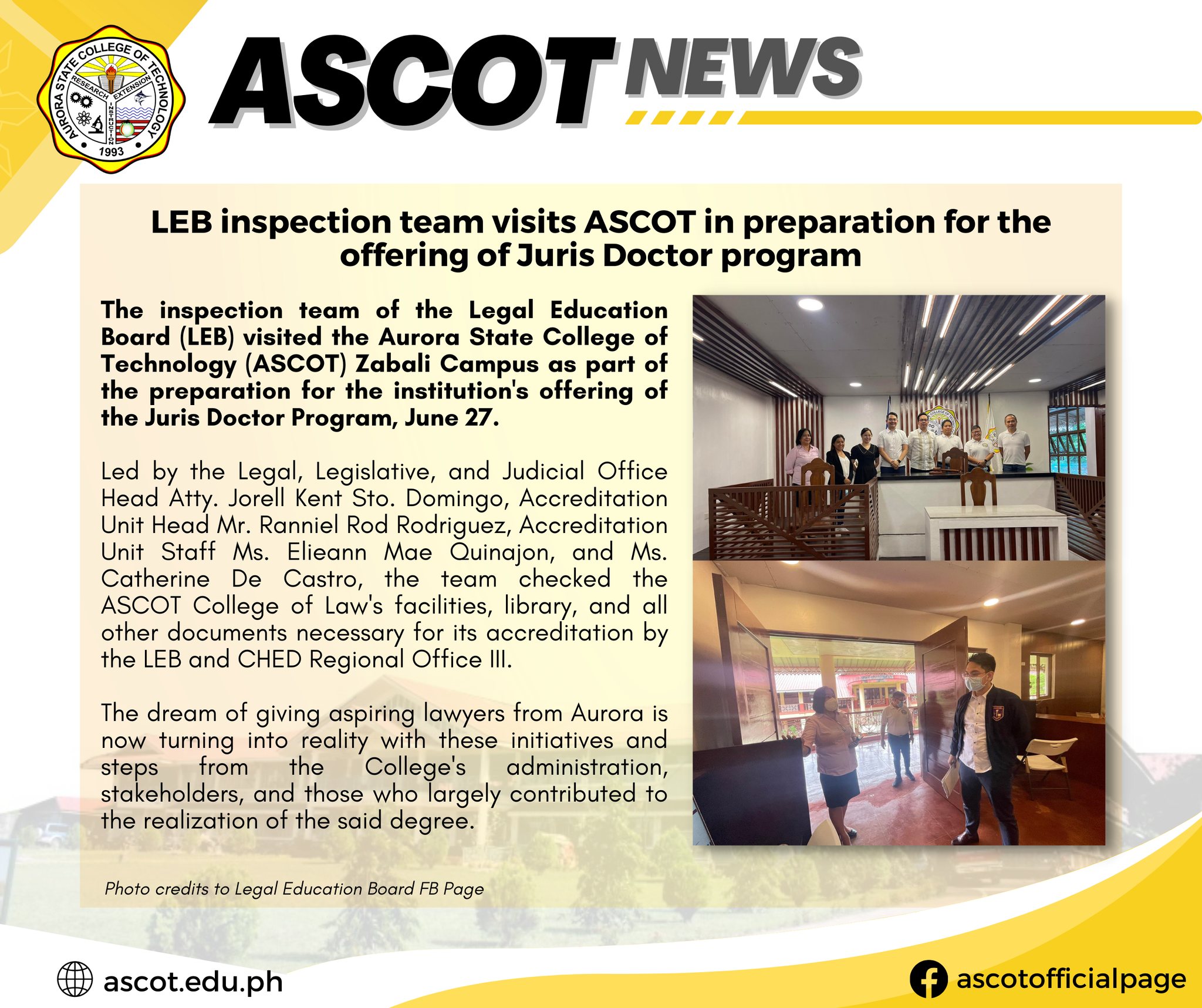 The inspection team of the Legal Education Board (LEB) visited the Aurora State College of Technology (ASCOT) Zabali Campus as part of the preparation for the institution’s offering of the Juris Doctor Program, June 27. Led by the Legal, Legislative, and Judicial Office Head Atty. Jorell Kent Sto. Domingo, Accreditation Unit Head Mr. Ranniel Rod continue reading : LEB inspection team visits ASCOT in preparation for the offering of Juris Doctor program