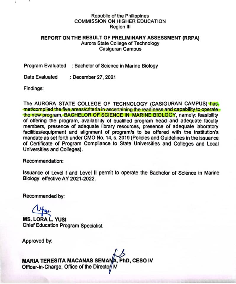 After complying and meeting the requirements in the five areas and criteria in ascertaining the readiness and capability to operate a new program, the Aurora State College of Technology (ASCOT) Casiguran Campus is now eligible to offer the Bachelor of Science in Marine Biology, effective this Academic Year 2021-2022 based on the result of the continue reading : ASCOT, now set to offer BS Marine Biology