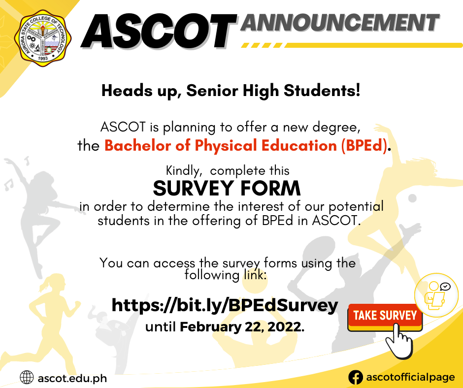 As one of the essential steps in starting a new course offering in higher education, the Aurora State College of Technology (ASCOT) conducted an online survey to its stakeholders to ascertain their interest in the proposed establishment of Bachelor of Secondary Education (BSED) Major in Social Studies and Bachelor of Physical Education (BPEd) in the continue reading : ASCOT plans to offer BSED Soc. Sci., BPEd, conducts online survey to stakeholders