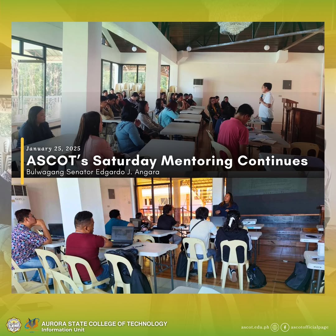 January 25, 2025- The Aurora State College of Technology (ASCOT ) continues to sharpen Research Excellencewith the second week of its Saturday Coaching and Mentoring Sessions, led by Dr. Ma Luz F. Cabatan, Vice President for Academic Affairs. Held at the Bulwagang Senator Edgardo J. Angara Upper Deck, Zabali Campus, the session provided faculty and continue reading : ASCOT’s Saturday Mentoring Continues