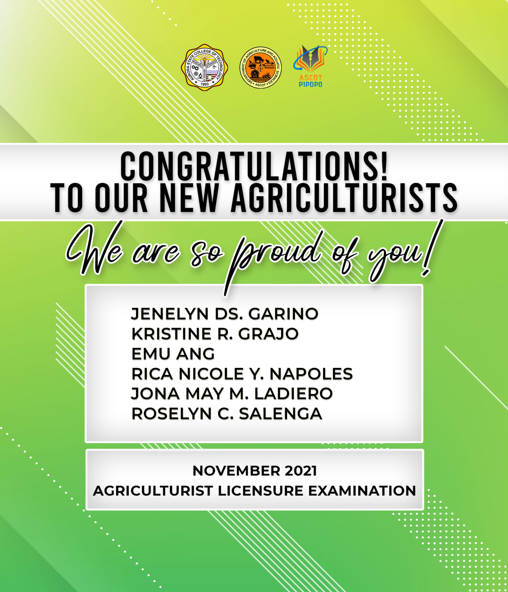 Proving its excellence in the field of agriculture, Aurora State College of Technology (ASCOT) Agriculture graduates passed the November 2021 Agriculturist Licensure Examination, from the result released, November 18. Showing what they got from the College’s quality education in the field of agriculture, ASCOT’s six newly Registered Agriculturists include Jenelyn DS. Garino, Kristine R. Grajo, continue reading : ASCOT BSA Grads pass the Agriculturist Licensure Exam