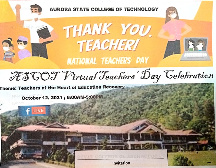 Showcasing the talents and skills of Aurora State College of Technology (ASCOT) Professors and Instructors in singing, dancing, and using innovative teaching strategies in the new normal, the College organized by the Socio-cultural Affairs Office and the Sentro ng Wika at Kultura held its 2nd Virtual Teachers’ Day Celebration via Zoom, October 12. Focusing on continue reading : ASCOT celebrates World Teachers’ Day through virtual competitions joined by its faculty members