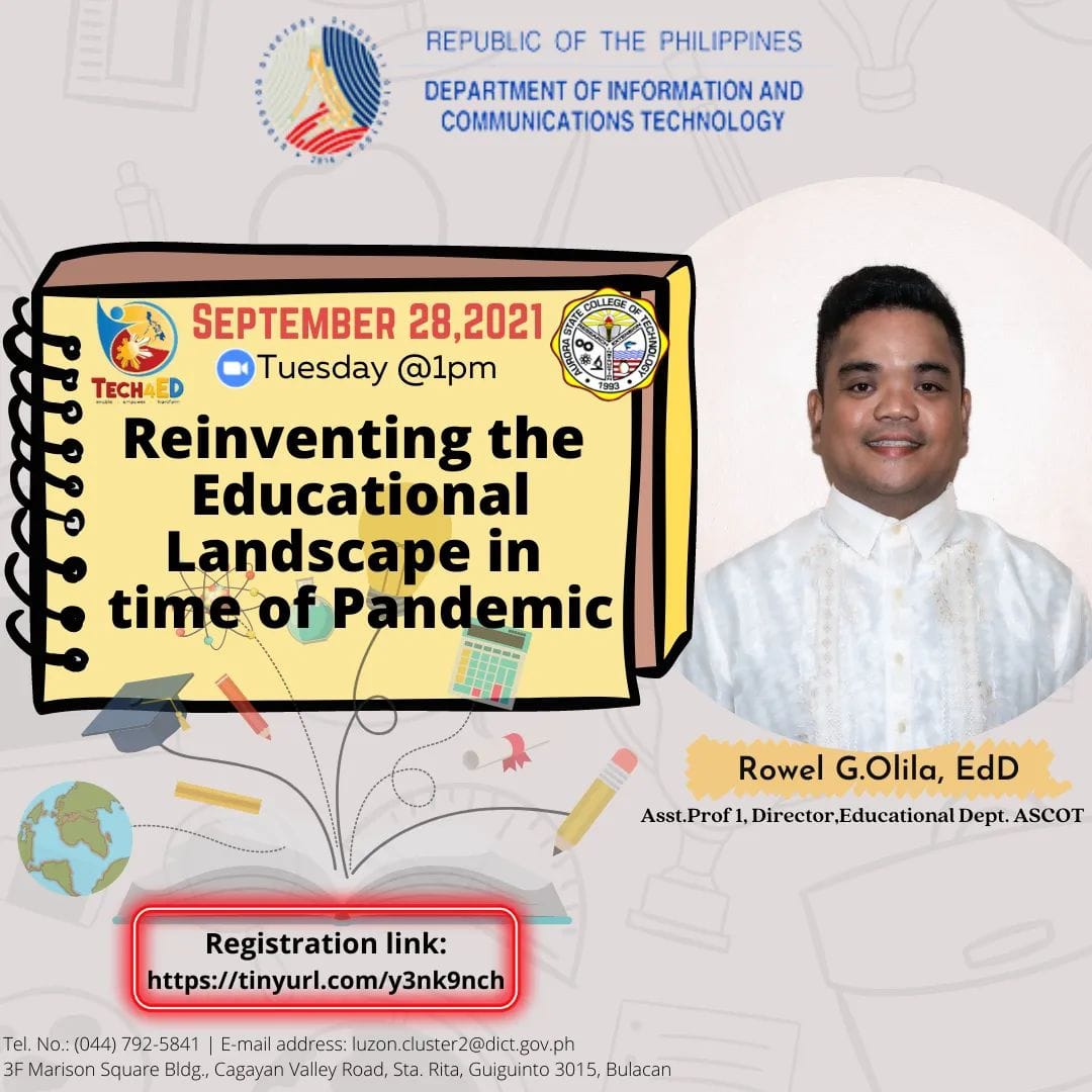 Sharing his knowledge and experiences on how the academic sector cope with the new standard mode of education and learning in this time of the pandemic, Dr. Rowel G. Olila, Director of the ASCOT Education Department, served as a Resource Speaker in the Department of Information and Communications Technology (DICT) Luzon Cluster 2 Webinar about continue reading : Educ. Dept. Director Olila serves as Resource Speaker in DICT LC2 New Normal Learning webinar