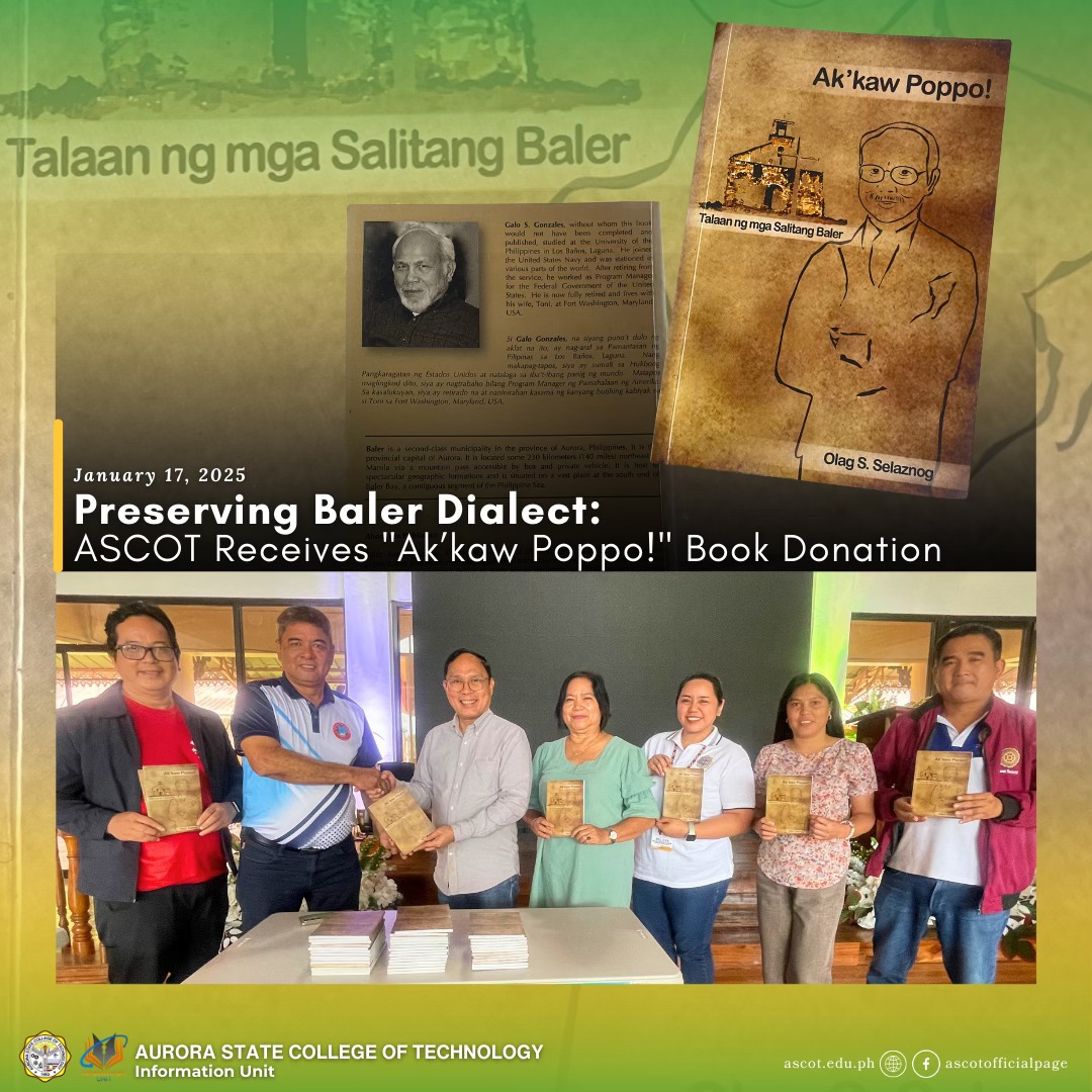 “Maganda ito para hindi maawala ang ating local dialect,” remarked Baler Municipal Councilor Lysander Ondey Querijero, a member and representative of Baler Aurora Ngayon Angkan at Kasaysayan (BANAK, INC.), during the ceremonial turnover of the book Ak’kaw Poppo! Talaan ng mga Salitang Baler to the Aurora State College of Technology (ASCOT) on January 17, 2025. continue reading : Preserving Baler Dialect: ASCOT Receives “Ak’kaw Poppo!” Book Donation