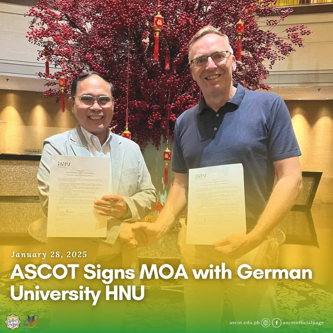 January 28, 2025 – The Aurora State College of Technology (ASCOT) continues to strengthen its global reach as President Renato G. Reyes met with Prof. Dr. Elmar Steurer, Vice President for Research, Transfer, and Internationalization of Hochschule Neu-Ulm University of Applied Sciences (HNU), Germany. The meeting marked a milestone in ASCOT’s internationalization efforts, culminating continue reading : ASCOT Signs MOA with German University HMU